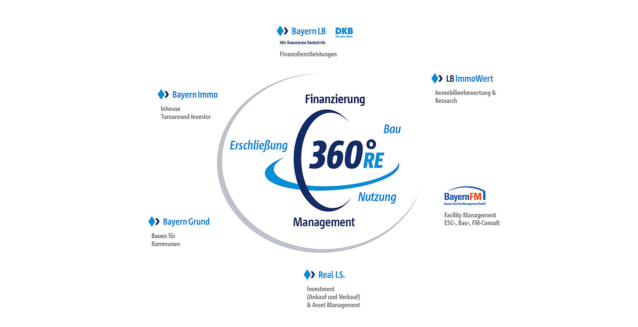 Als Tochtergesellschaft der BayernLB gehören wir zu einem starken Verbund, der Kunden weit über die Finanzierung ihrer Immobilien hinaus begleitet. Unsere Teams unterstützen Projektentwickler, Investoren, Wohnungsunternehmen, institutionelle Fondsinitiatoren oder Assetmanager entlang der kompletten Wertschöpfungskette. Diesen Rundum-Service nennen wir 360° Real Estate-Angebot – kurz: 360° RE.