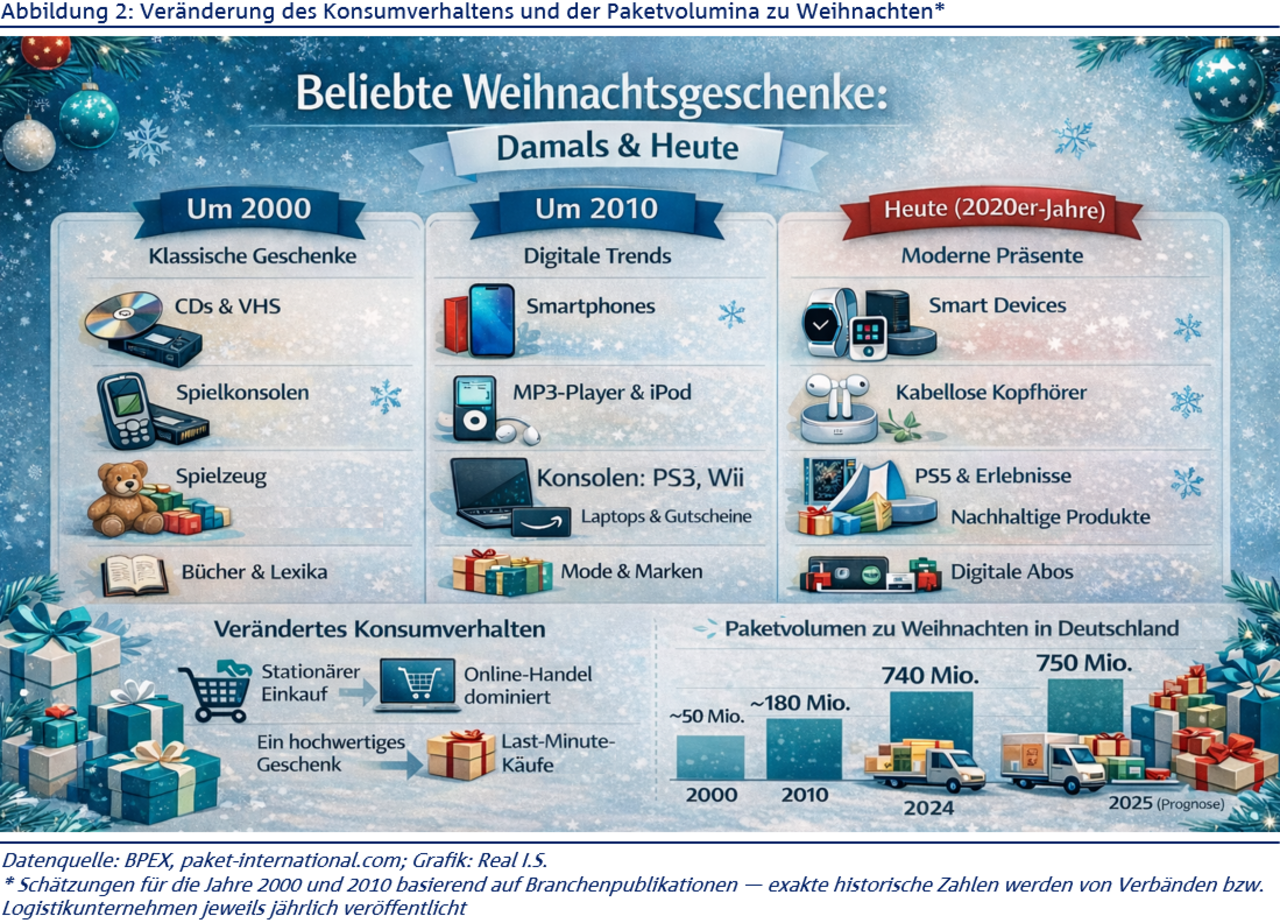 Die Digitalisierung des Einkaufs, bequemere Zustelloptionen, Paketstationen (Click-&-Collect), schnellere Lieferungen und kostenlose Retouren haben das Kaufverhalten stark verändert. So stehen heute ganz andere Geschenke auf dem Wunschzettel als vor 25 Jahren (siehe Abbildung 2):