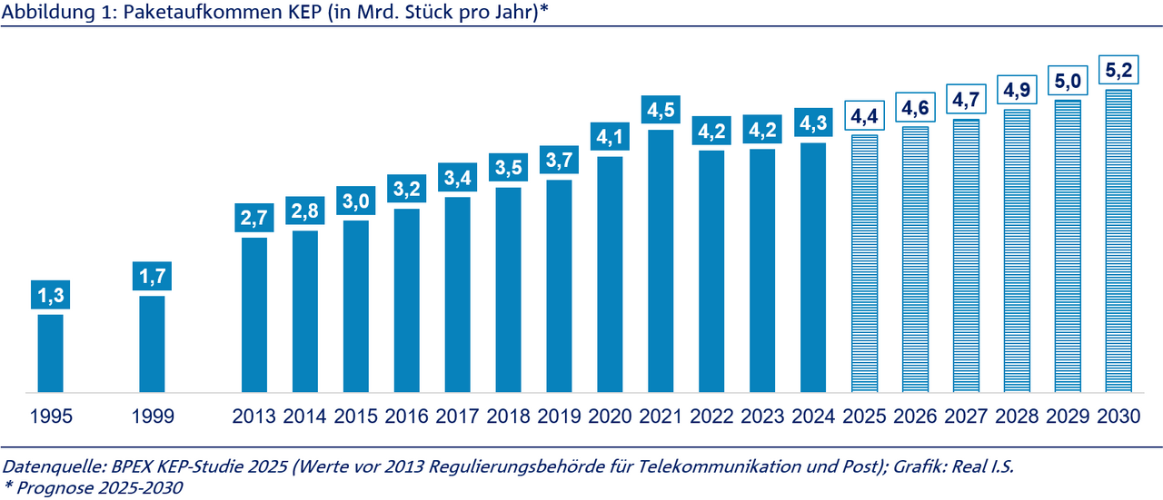 Und Verteilzentren wie L.I.S.A werden inzwischen dringend benötigt. Denn das Paketaufkommen (KEP – Sendungen aus dem Kurier-, Express- und Paket-Bereich) ist in Deutschland über die Jahre deutlich angestiegen: von rd. 1,3 Mrd. Mitte der 1990er Jahre auf jährlich 4,3 Mrd. Sendungen im Jahr 2024 (siehe Abbildung 1). Besonders ab 2010 sind die Paketmengen getrieben vom wachsenden Online-Handel stark angestiegen. Und die Corona-Pandemie hat 2020 und 2021 den E-Commerce-Boom noch zusätzlich befeuert. Dieser Aufwärtstrend wird sich laut Prognosen auch in den kommenden Jahren fortsetzen.